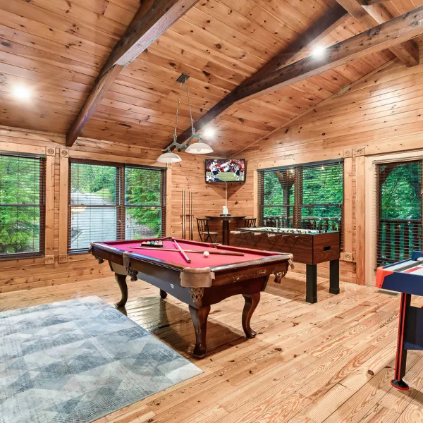 Step inside and feel the cozy ambiance envelop you as a crackling fireplace sets the mood for a memorable vacation. Our cabin features a private hot tub, inviting you to indulge in blissful relaxation while surrounded by the tranquility of nature. Sink into the warm bubbles and let your worries melt away. Enjoy the peaceful deck from the hot tub or hop into the entertaining game room for some fun! The Ryland also has low speed T Mobile 5G Cellular internet and smart TVs for you to use your own apps. No cable TV needed!